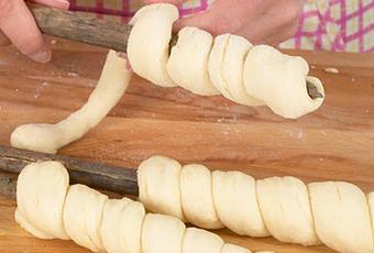- Teig in 12 etwa gleichgroße Stücke teilen. Jeweils ein Stück zu einer 2 cm dicken Wurst rollen und um das spitze Ende des Stockes wickeln. Drehend über der Glut rösten.