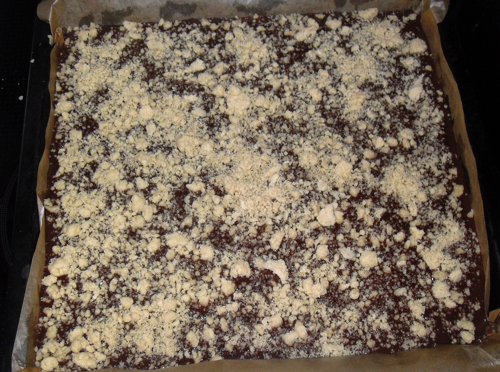Backofen auf 180 Grad (Ober-/Unterhitze) vorheizen und ein tiefes Backblech mit Backpapier auslegen.3/4 der Teigkrümel auf dem Blech verteilen und gut festdrücken - ich habe zusätzlich meinen Teigroller genommen um die Masse festzudrücken.
