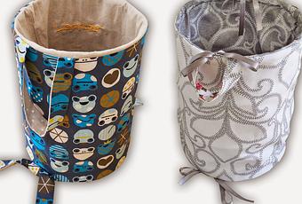 Den ersten Korb habe ich aus einem weiß-grauen Jacquardstoff und grauen Satinbändern zum Geburtstag meiner Freundin Dunja genäht. Den anderen gab es zur Geburt des kleinen Leander.