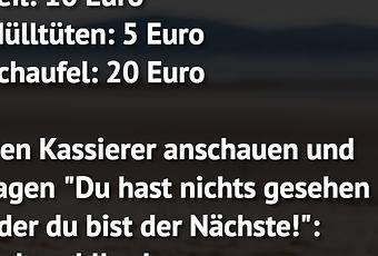 Auf Facebook teilen Vorige Folgende Seil: 10 Euro Mülltüten: 5 Euro Schaufel: 20... Autor des Artikels : istdaslustig Zum Original-Artikel Seil: 10 Euro Mülltüten: 5 Euro Schaufel: 20 Euro Den Kassierer anschauen und sagen "Du hast nichts gesehen oder du bist der Nächste!": Unbezahlbar! Hier geht es zum Artikel Mehr Lustiges auf www.istdaslustig.de Auf Facebook teilen Vorige Folgende Das könnte Ihnen gefallen Mehr