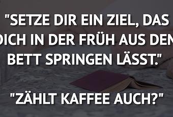 Auf Facebook teilen Vorige Folgende "SETZE DIR EIN ZIEL, DAS DICH IN DER FRÜH AUS... Autor des Artikels : istdaslustig Zum Original-Artikel "SETZE DIR EIN ZIEL, DAS DICH IN DER FRÜH AUS DEM BETT SPRINGEN LÄSST." "ZÄHLT KAFFEE AUCH?" Hier geht es zum Artikel Mehr Lustiges auf www.istdaslustig.de Auf Facebook teilen Vorige Folgende Das könnte Ihnen gefallen Mehr