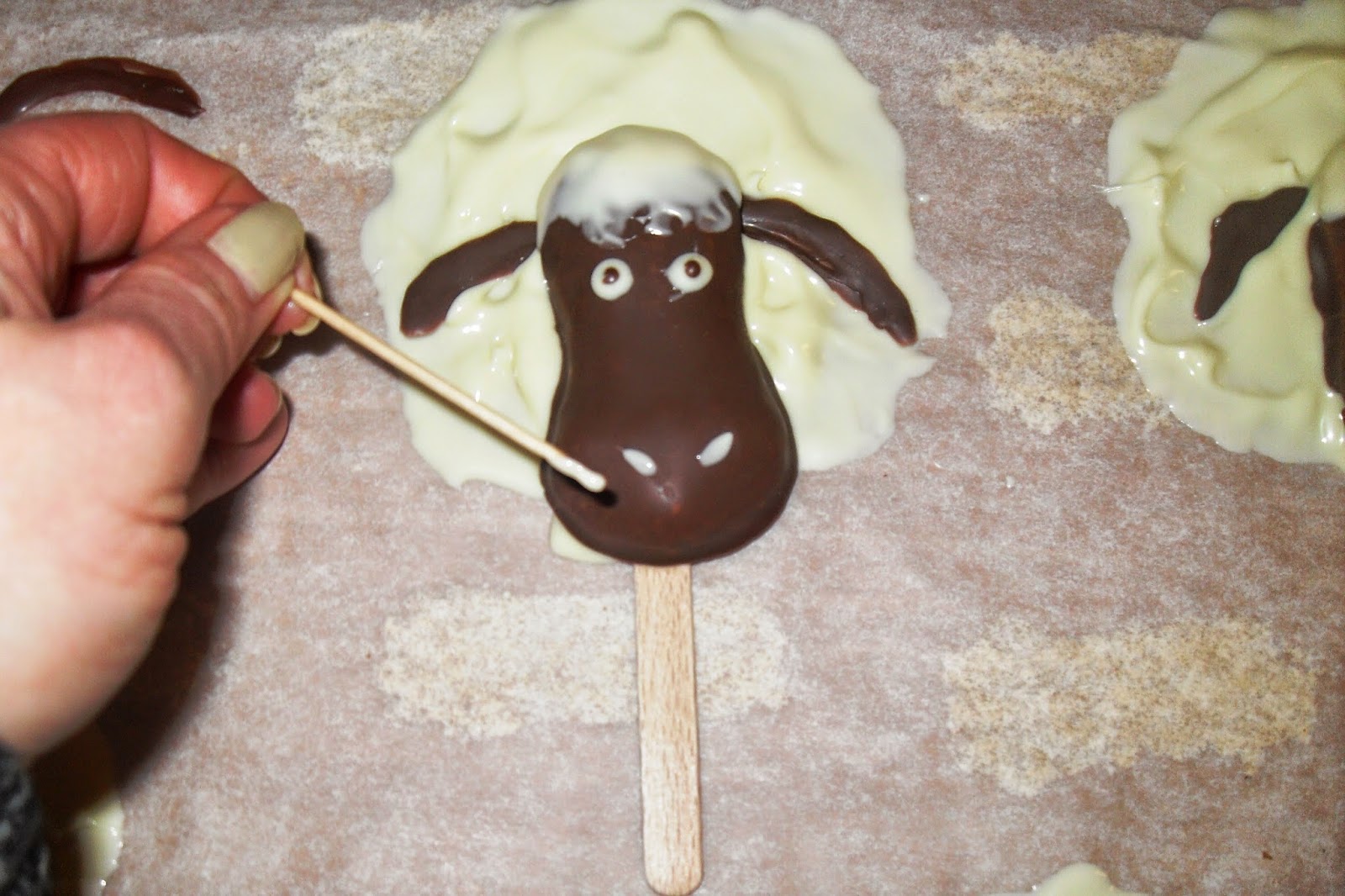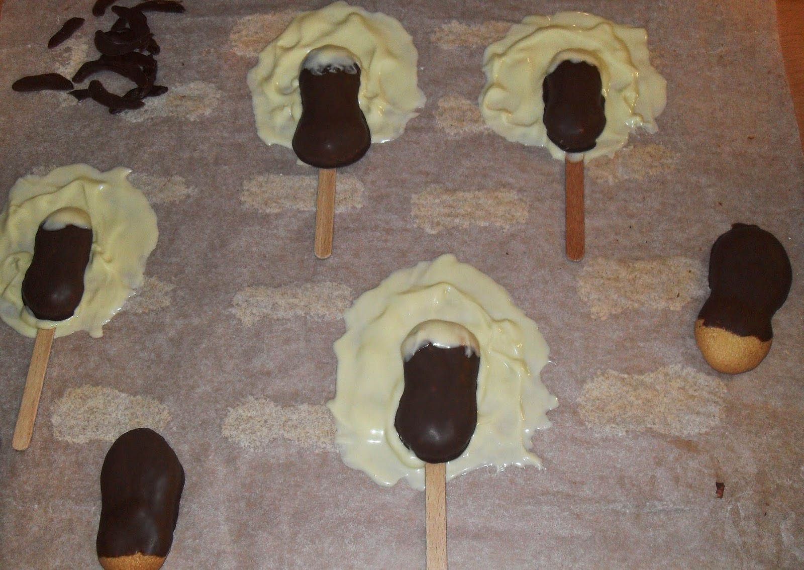 Einen Spatel als Stiel wie angezeigt auflegen und wieder etwas weiße Schokolade darüber verteilen.Während der Trocknungszeit könnt ihr dann schon mal die Biskuitplätzchen mit der dunklen Kuvertüre überziehen (Oberseite genügt). Ebenfalls trocknen lassen.Die getrockneten Plätzchen werden dann auf die weiße Schokoladenfläche "geklebt" (mit weißer Kuvertüre. Die Ohren können nun auch vom Papier abgelöst und angelegt werden.Wieder trocknen lassen.