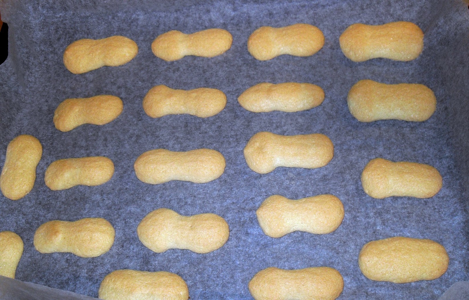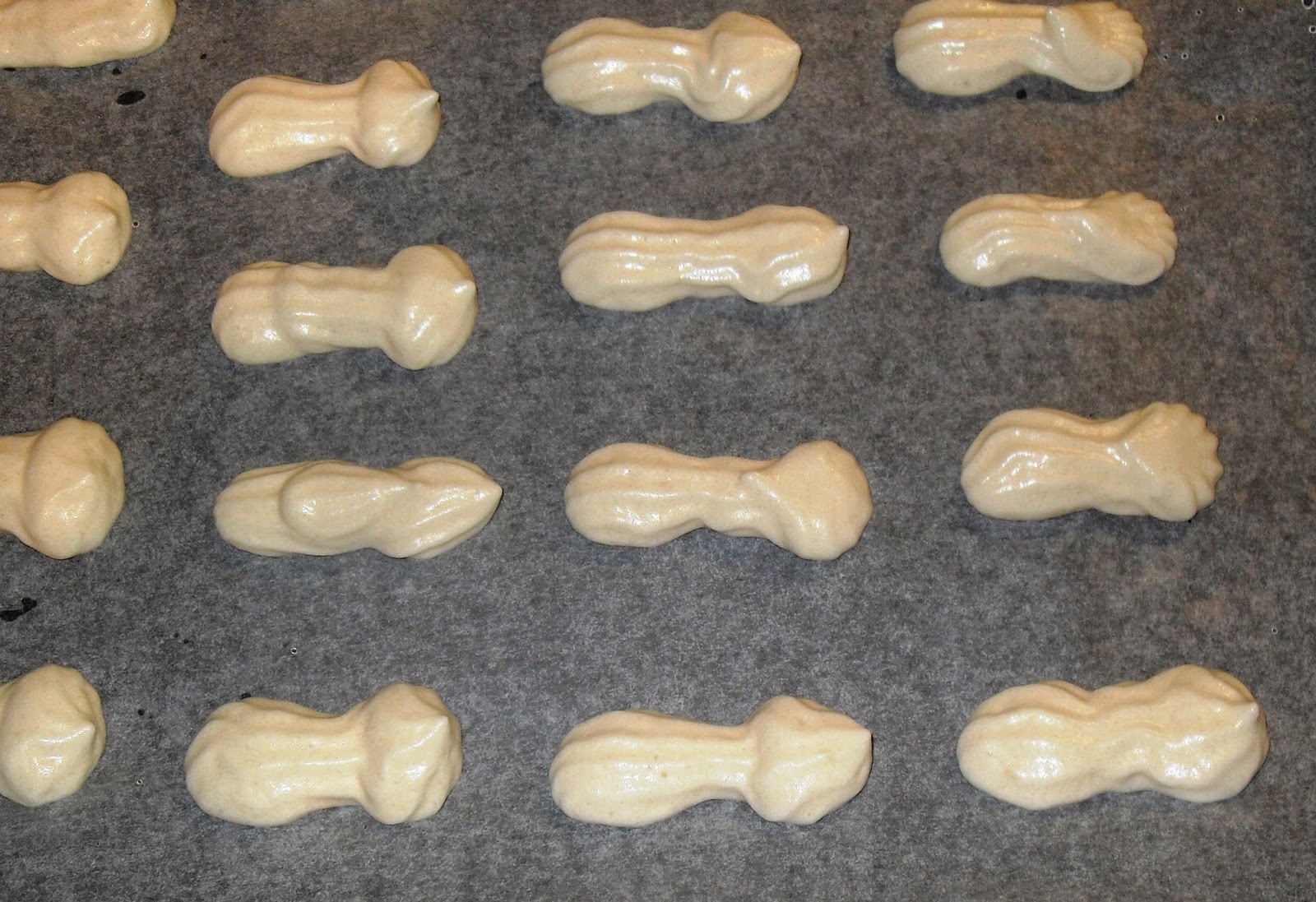 Den Teig in einen Spritzbeutel füllen (ich habe eine Sterntülle eingesetzt, ein Loch funktioniert aber auch, da der Teig auseinander läuft).und auf ein Backblech (mit Backpapier belegt) in Streifen spritzen. Dabei darauf achten, das sich die Enden verdicken.