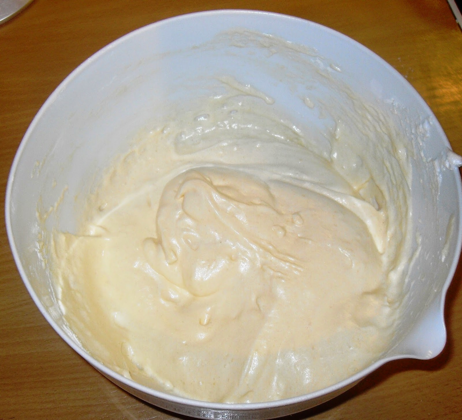 Nun in 2 Portionen den Eischnee dazu geben und auch eine Hälfte des Mehlgemisches darüber sieben. Vorsichtig mit einem Schneebesen unterheben. Ebenso mit der zweiten Hälfte Eischnee und Mehlmischung verfahren.