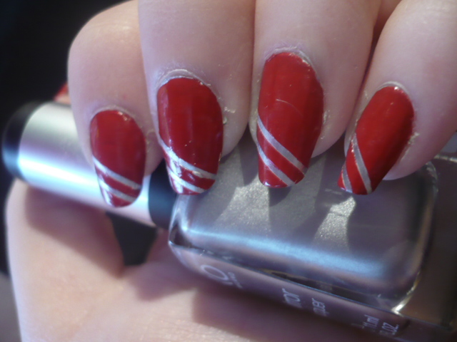 Anleitung:Zuerst die kompletten Nägel mit dem silbernen Lack grundieren und alles gut trocknen lassen.Danach jeweils zwei Streifen der weißen Stripes auf den Lack kleben und alle Nägel noch einmal komplett rot lackieren.