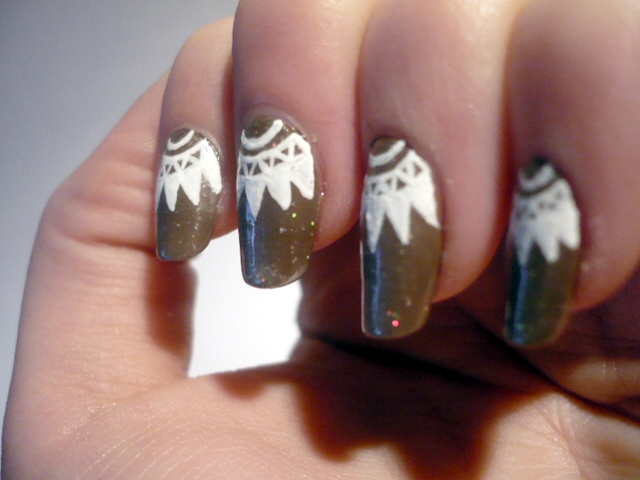 So ... mit weißer Acrylfarbe und meinem geliebten Pinsel habe ich noch dieses kleine Design auf meine Nägel gebracht. Das war mit der rechten Hand wirklich einfach zu zeichnen, aber mit der linken Hand war das dann schon gar nicht mehr so einfach. :) Meine Hände haben gezittert und ich war schon kurz davor aufzugeben, aber wenn man weiter macht, gewöhnen sich die Hände irgendwann an die komische Haltung und sie zittern nicht mehr so. Komisch, dass ich das vergessen habe, wo ich letztes Jahr so viele Nageldesigns gemacht habe, wo man auch eine ruhige Hand brauchte. :) Sachen gibt's.Aber für den Fall habe ich mir jetzt Nail Art Pens von Rival de Loop in weiß und schwarz geholt und werde mal ausprobieren, ob es einfacher ist, mit denen solche Muster auf die Nägel zu bringen als mit meiner geliebten Acrylfarbe und dem Pinsel. :D