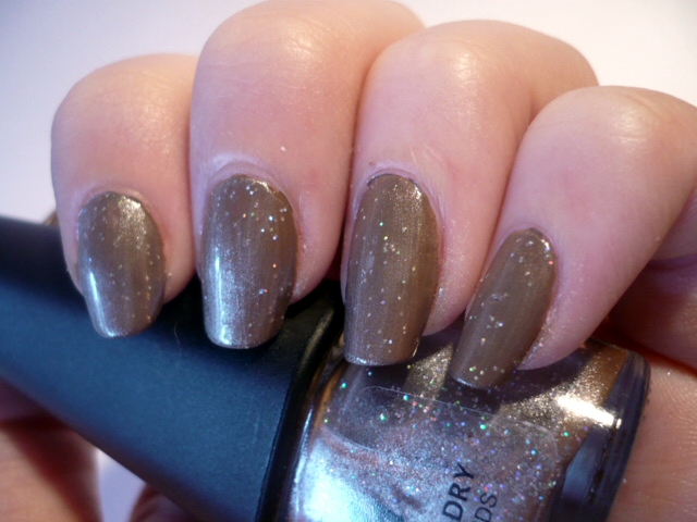 Ich finde diesen Lack wirklich sehr schön. Im Prinzip keine so besondere Farbe, aber ich finde diesen Glitzer dadrin einfach so schön. Die Glitzerpartikel sind doch eher vereinzelt vorhanden und nicht so fein, weshalb sie schnell auf dem Lack hervorstechen. Der Lack selbst hat einen Grundschimmer und die in allen Farben schillernden Glitzerpartikel stechen wunderschön hervor. :)