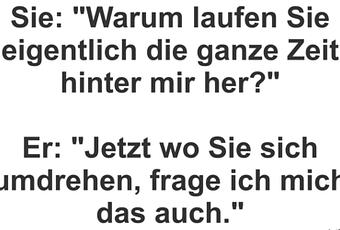 Auf Facebook teilen Vorige Folgende Sie: "Warum laufen Sie eigentlich die ganze... Autor des Artikels : istdaslustig Zum Original-Artikel Sie: "Warum laufen Sie eigentlich die ganze Zeit hinter mir her?" Er: "Jetzt wo Sie sich umdrehen, frage ich mich das auch." Hier geht es zum Artikel Mehr Lustiges auf www.istdaslustig.de Auf Facebook teilen Vorige Folgende Das könnte Ihnen gefallen Mehr