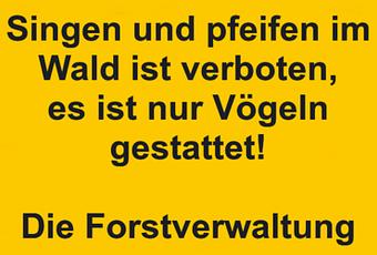 Auf Facebook teilen Vorige Folgende Singen und pfeifen im Wald ist verboten, es ist... Autor des Artikels : istdaslustig Zum Original-Artikel Singen und pfeifen im Wald ist verboten, es ist nur Vögeln gestattet! Die Forstverwaltung Hier geht es zum Artikel Mehr Lustiges auf www.istdaslustig.de Auf Facebook teilen Vorige Folgende Das könnte Ihnen gefallen Mehr