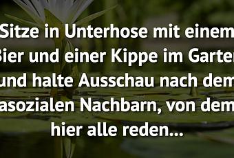 Auf Facebook teilen Vorige Folgende Sitze in Unterhose mit einem Bier und einer... Autor des Artikels : istdaslustig Zum Original-Artikel Sitze in Unterhose mit einem Bier und einer Kippe im Garten und halte Ausschau nach dem asozialen Nachbarn, von dem hier alle reden... Hier geht es zum Artikel Mehr Lustiges auf www.istdaslustig.de Auf Facebook teilen Vorige Folgende Das könnte Ihnen gefallen Mehr