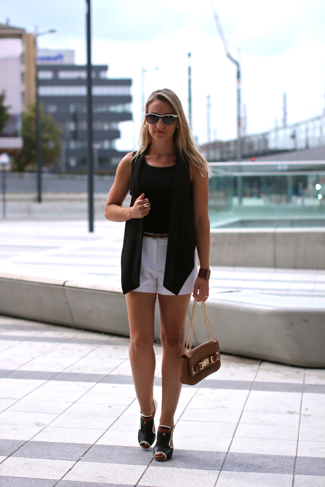 Suchbild: Findet ihr meine neuen Lieblinge? Denn das letzte Outfit meiner "summer holiday collection" ist ein wahres Sammelsurium von neuen und alten "Lieblingen". Zum einen wären da meine neuen superbequemen Echtleder-heels, die mir meine große Schwester im gemeinsamen Rhodos-Urlaub gekauft hat (Du bist die liebste Schwester, die man sich nur wünschen kann - nicht nur, weil Du mir so tolle Schuhe kaufst :-) ...). Dann wäre da noch meine wunderschöne neue Michael Kors Clutch, die ich mir bei meinem letzten Besuch im Designer Outlet Parndorf gekauft habe. Und perfekt zu meinen neuen Errungenschaften passen meine "alten Lieblinge" wie das braune Lederarmband von Swarovski (bereits über fünf Jahre alt, kann man gar nicht mehr erinnern), meine schwarze Weste (bereits vier Jahre alt) und meine schwarz-weiße Sonnenbrille (über ein Jahr alt). Fertig ist mein Sommerurlaubslook, den ich am letzten Urlaubsabend zu einem schönen Abendessen ausgeführt habe. - Was sagt ihr zu meinem heutigen Look?Picture puzzle: Can you find my new favorites? Cause my "summer holiday collection's" last outfit is a real smorgashbord of new and old favorites. On the one hand there are my new & super comfy leather heels, which are a gift from my beloved big sista during our common holidays at Rhodes (you're the best sister in the world which you can imagine - not only cause you've bought me these lovely heels :-) ....) Furthermore there is my new amazing Michael Kors Clutch - a purchase of my last visit at Designer Outlet Parndorf. Perfect matching partners for these new achievements are my "old favorites" like my brown leather bracelet from Swarovski (more than five years old, I can't remember exactly), my black vest (four years old) and my black&white sunglasses (more than one year old). And there we have my summer holiday look, worn at dinner at our last holiday evening. - What do you think about my OOTD?