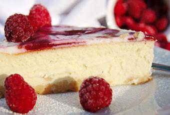 Saure Sahne mit dem Zucker verrühren und auf den Kuchen streichen. Das Himbeerpüree in Klecksen darauf geben und verteilen, so dass eine Marmorieurng entsteht. Den Kuchen weitere 10 Minuten backen.