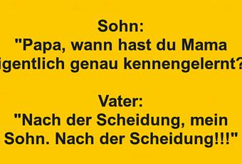 Auf Facebook teilen Vorige Folgende Sohn: "Papa, wann hast du Mama eigentlich genau... Autor des Artikels : istdaslustig Zum Original-Artikel Sohn: "Papa, wann hast du Mama eigentlich genau kennengelernt?" Vater: "Nach der Scheidung, mein Sohn. Nach der Scheidung!!!" Hier geht es zum Artikel Mehr Lustiges auf www.istdaslustig.de Auf Facebook teilen Vorige Folgende Das könnte Ihnen gefallen Mehr