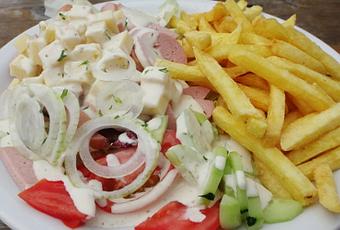 Heute ein Wurstkäsesalat; also ein Cervelat-Massaker für Zahnlose und Löffelesser. Das ganze angereicher mit verschiedenen vitaminreichen Gemüsen.