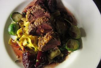 Wildschweinfilet mit Maronikruste, Gewürzpflaumen und Glühweinsauce
