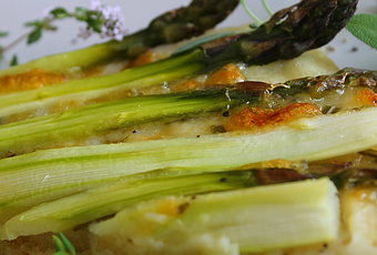 Den Teig ausrollen und auf das Backblech legen, mit 1 EL Olivenöl bestreichen. Die Mozzarellamischung auf den Teig verteilen, darüber den Spargel legen, für ca. 20 Minuten backen.