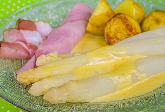 Spargel mit Orangen Hollandaise, Kartoffeln und Schinken