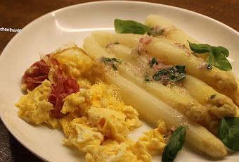 - Spargel aus dem Wasser heben, abtropfen lassen und mit dem Rührei anrichten