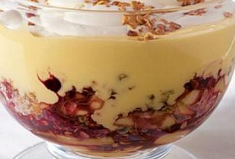 - Keksbrösel, Creme und Soße in mehreren Schichten in eine große Glasschüssel schichten. Trifle mit einer Cremeschicht beenden. Einige Keksbrösel und Rest Karamellsoße darauf verteilen.