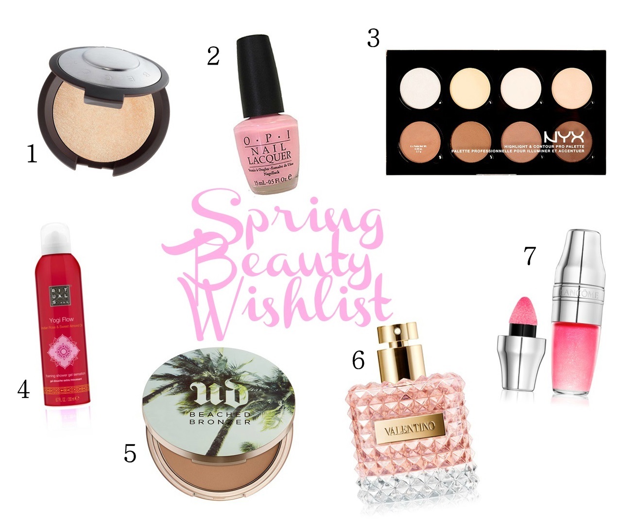2. OPI Nail Polish in Pink-Ing of You: Ein sehr schöner aber nicht allzu knalliger Rosaton. Die Farbe ist perfekt für den Frühling! 3. NYX Highlight & Contour Pro Palette: Konturieren geht immer vor allem wenn man ein wenig gebräunt ist dann sieht es umso toller aus. 4. Rituals Yogi Flow Foaming Shower Gel: Als ich letzten Winter in Berlin war habe ich mir zwei der Foaming Shower Gels geholt und war restlos begeistert. Für den Frühling möchte ich gerne etwas blumiges haben, da passt Yogi Flow super. 5. Urban Decay Beached Bronzer in Bronzed: Mein Hoola Bronzer neigt sich dem Ende zu und da ist Bronzed der perfekte Nachfolgekandidat. Alleine schon wegen der Verpackung, da bekommt man Lust auf Sommer! 6. Valentino EdP Donna: Ich muss gestehen.. bei diesem Duft hat mir der Flakon es sofort angetan, auf die Duftbeschreibung bin ich erst später eingegangen. Donna sieht wirklich aus wie Schmuckstück, ich habe schon lange nicht mehr eine so schöne Parfümflasche gesehen. 7. Lancome Juicy Shaker in Lemon Explosiv: Es ist zwar ein Lipgloss aber der Juicy Shaker lässt die Lippen so toll aussehen. Gepflegt, glänzend und voll.Was steht auf eurer Wunschliste?