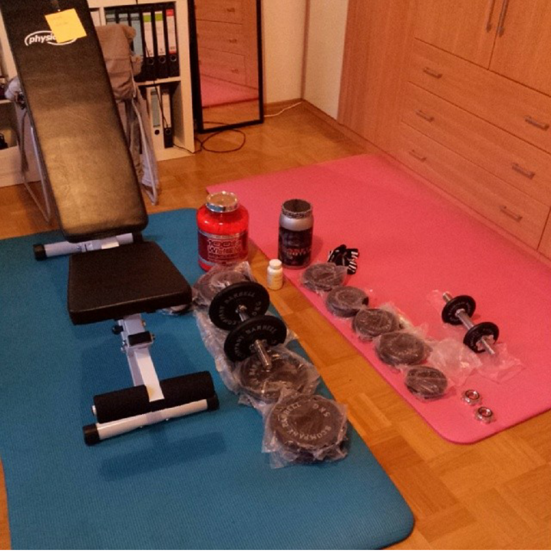 Außerdem kamen unsere Gewichte, Hanteln und die Bank vom ♥-Mann an, diewir er die zwei Etagen raufgeschleppt hat!