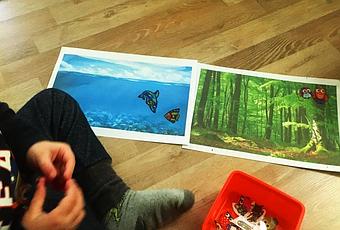 Also ihm einfach Sticker hinwerfen und abwarten was passiert, wird bei ihm nicht funktionieren. Ich druckte ihn zwei Umgebungen aus: Einen Wald und eine Unterwasserwelt. In einen Haushaltsdiscounter fand ich ein Paar Tieraufkleber: Eulen und Fische. Die Aufgabe ist es nun also die Tiere in ihre richtige Umgebung aufzukleben. Mit dieser kleinen Auswahl wollte ich erstmal schauen wie das Spiel ankommt.