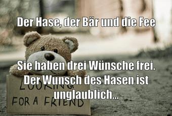 Ein Hase und ein Bär gehen durch den Wald. Auf einmal taucht eine Fee auf und sagt: