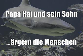 Papa Hai und Sohn Hai schwimmen im Meer herum und sind hungrig. Da entdecken sie an der Oberfläche eine Gruppe Menschen, die da herumschwimmen.