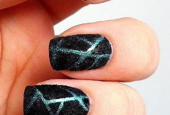 Dafür werden die Nägel normal nach Wahl lackiert, trocknen gelassen, dann beliebig mit dem dünnen Tape beklebt und schließlich wird eine andere Farbe komplett darüber lackiert.