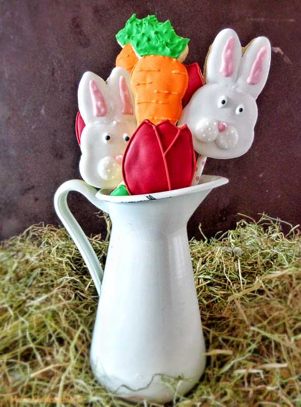Für meinen aktuellen Beitrag für Süße Kreationen Blog, habe ich mit der in Ausgabe 4 erhältlichen Spritzflasche und der kleinen Lochtülle, Oster Cookies am Stiel hergestellt & dekoriert. Mit etwas Übung ( am Besten an einigen extra gebackenen Cookies ), ist es gar nicht mehr so schwierig wie es event. Anfangs ausschaut. Das Wichtigste ist, das der Teig dick genug ausgerollt und gestochen wird. Und das Icing die richtige Konsistenz. Das alles bekommt man durch etwas probieren recht schnell raus.