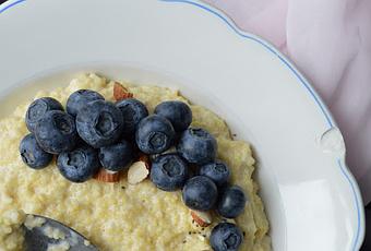 Zubereitung des Risottos:- Die ungekochte Hirse heiß waschen und abtropfen lassen. - Währenddessen Milch und Wasser aufkochen lassen. Hirse und Honig langsam einrühren und bei mittlerer Hitze köcheln lassen, bis die Hirse die Flüssigkeit zur Gänze aufgesogen hat. - Nun das griechische Joghurt dazugeben, mit Blaubeeren und Mandeln garnieren und genießen.