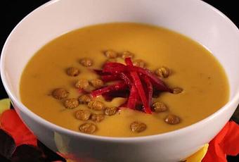 Suppe mit dem Stabmixer kurz auf mixen und in vorgewärmten Schalen anrichten.
