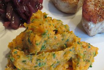 Bei uns gab es dieses Süßkartoffelpüree mit Bärlauch zu Schweinemedaillons vom Iberischen Schwein mit Rotwein-Balsamico-Zwiebeln – siehe Bild ganz oben.