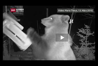 Video aus dem Münstertal gesehen? Es zeigt das Bärenmännchen M32, das kürzlich von einem RhB-Zug überfahren und getötet wurde; das Video wujrde vor wenigen Wochen aufgenommen. Der Jungbär überwindet locker den Elektrozaun eines Bienenhäuschens, der an diesem Tag nicht funktioniert, und macht sich dann an den Honig. Der Tierfilmer, der die Kamera am Bienenhäuschen montiert hatte, gab die Bilder jetzt erst frei. Fürs Schweizer Fernsehen.