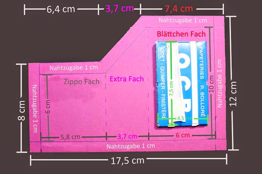 Aus dem Innenstoff schneidet ihr ein Stück mit den Maßen 22 cm x 17,5 cm aus. Das Stoffstück wird in der Mitte gefaltet (fest mit dem Bügeleisen den Falz fixieren, damit nichts mehr verrutscht), so dass sich ein Stück mit den Maßen 11 cm x 17,5 cm ergibt. Das Stück wird im Folgenden „D1“ genannt.Weiter schneidet ihr aus einem Stück Leder euer Papes-Schnellentnahme-Fach aus. Falls ihr dickes Kunstleder oder Echtleder verwendet, müsst ihr dieses nicht stabilisieren. Ich hatte jedoch nur ein dünnes Kunstleder , deshalb hab ich dieses mit Bügelvlies/Bügelschabracke (z.B. S320) gestärkt.Beim Papes Schnellentnahme Fach kommt es jetzt natürlich auf die Sorte Blättchen an, mit welchem ihr euren Tabak dreht. Meine bessere Hälfte nimmt die OCB Blättchen, deshalb ist diese Anleitung an den Maßen dieser Blättchen ausgerichtet. Ihr benutzt keine OCB Blättchen:Ihr könnt das nachfolgende Schnittmuster aber auch ganz einfach an eure Lieblingsblättchen anpassen. Dazu nehmt ihr die Breite eurer Blättchenhülle (bei den OCB Blättchen waren das 4,5 cm, grüne Maßangabe unten) plus 1,5 cm. Das ist dann die Breite eures "Blättchen Fachs" (bei mir also 6 cm, rote Maßangabe unten). Je nach dem, wie breit euer "Blättchen Fach" nun ist, müsst ihr die Breite eures "Extra Fachs" (bei mir 3,7 cm, lila Maßangabe unten) breiter/schmaler anpassen. Die grauen und weißen Maßangaben solltet ihr wie im unteren Schnittmuster lassen.Ihr benutzt OCB Blättchen:Im nachfolgenden Bild seht ihr, wie ihr euer Leder für die OCB Blättchen zuschneiden/einteilen müsst: