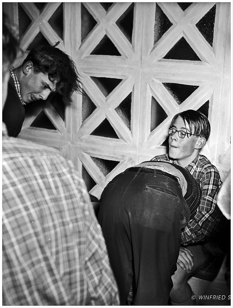 Dieses Spiel wurde ausschließlich in Jungengruppen gespielt und nannte sich "Schinkenklopfen". Ein Junge hielt einen anderen Jungen, wie oben zu sehen, in einem festen Klammergriff und die anderen Jungen der Jugendgruppe stellten sich wie in einer Reihe an und dann durfte jeder mit voller Wucht demjenigen, der festgehalten wurde, auf den Po hauen.