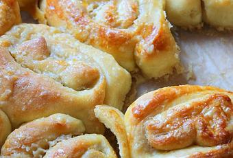 - Die Hälfte dem Teig auf der bemehlten Arbeitsplatte 1/2 cm dünn ausrollen. Den Teig zuerst mit Tahini bestreichen, dann darüber etwas Zucker und eine Hand voll gehackte Walnüsse bestreuen. Den Teig wieder rollen und mit Hilfe einem Messer in 2 cm Breite Stücken schneiden. Die Teigröllchen auf dem Backblech mit etwas Abstand legen. Mit Eigelb bestreichen. Im vorgeheizte Backofen ca. 20 Minuten goldbraun backen. Mit der anderen Hälfte gleiche Arbeit wiederholen.