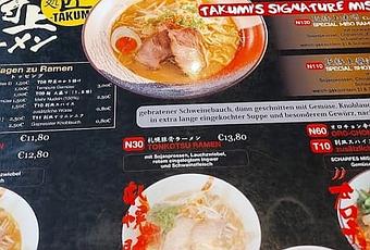 Die Ramen-Suppen von Takumi werden nach traditionellen japanischen Rezepten zubereitet und bestehen aus einer Basis aus kräftiger Brühe, in der Nudeln, Gemüse, Ei und Fleisch serviert werden. Die Brühe wird sorgfältig ausgewählt und gekocht, um den perfekten Geschmack zu erzielen. Das Restaurant bietet auch vegetarische und vegane Optionen sowie verschiedene Beilagen und japanische Snacks wie Gyoza und Karaage an.