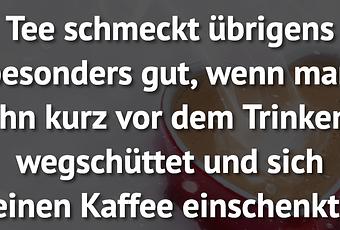 Auf Facebook teilen Vorige Folgende Tee schmeckt übrigens besonders gut, wenn man... Autor des Artikels : istdaslustig Zum Original-Artikel Tee schmeckt übrigens besonders gut, wenn man ihn kurz vor dem Trinken wegschüttet und sich einen Kaffee einschenkt! Hier geht es zum Artikel Mehr Lustiges auf www.istdaslustig.de Auf Facebook teilen Vorige Folgende Das könnte Ihnen gefallen Mehr
