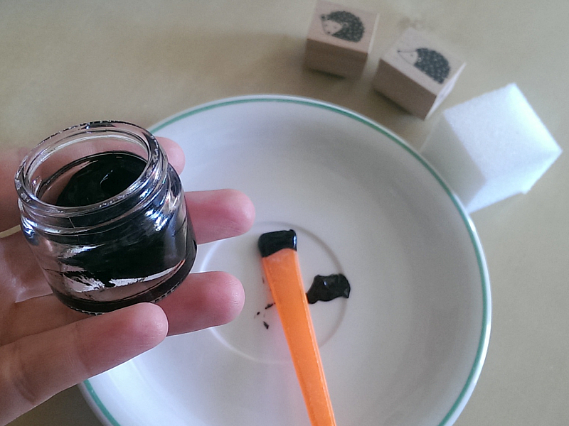 Auf eine Untertasse soll etwas von der Stempelfarbe gegeben werden um diese dann mit dem Schwämmchen auf den Stempel zu tupfen. Man muss aufpassen die Farbe nicht zu dick aufzutragen.