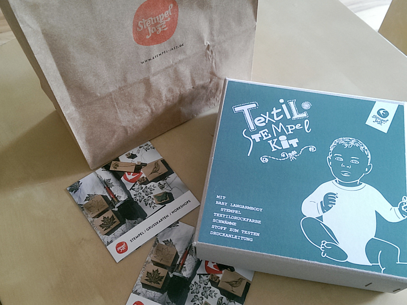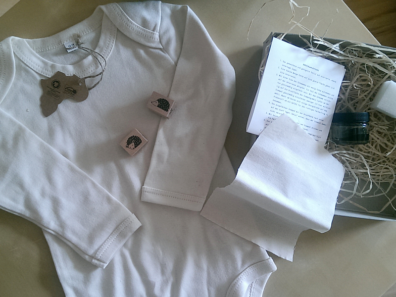 In dem Set enthalten war ein Body, Textilfarbe, 2 Stempel, ein Schwämmchen, etwas Stoff zum probe stempeln und eine Anleitung.