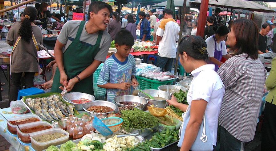 Wahrscheinlich von uns animiert, bestellten die Gäste am Nachbartisch ebenfalls eine Flasche Wein. Und erhielten Weingläser dazu. Die netten Kommentare meiner Freunde führten zu fröhlichem Gelächter und bewegte die Kellnerin, uns umgehend ebenfalls Weingläser zu bringen. Die Stimmung konnte nicht besser sein. An diesem Abend schauten wir etwas tiefer als üblich - in die Weingläser.Wenn man denkt, man habe es begriffen, kommt es vielleicht doch anders. Die Sprache des Lächelns muss gelernt sein. Wann ist einfach, einfach immer - und vor allem dann, wenn es einem eigentlich vergangen ist. Lächelt man trotzdem ist, es nur noch halb so schlimm. Das hilft wirklich, wenigstens mir.Markt in Thailand: Lächeln ist eine Sprache, welche die Ware noch frischer macht.