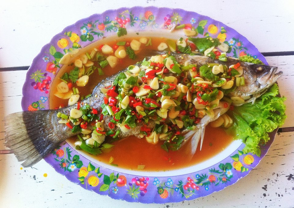 Pla Kapong Nueng Manao: Ped Maak - Fisch in Zitronensauce schön scharf mit viel Chili und Knoblauch.