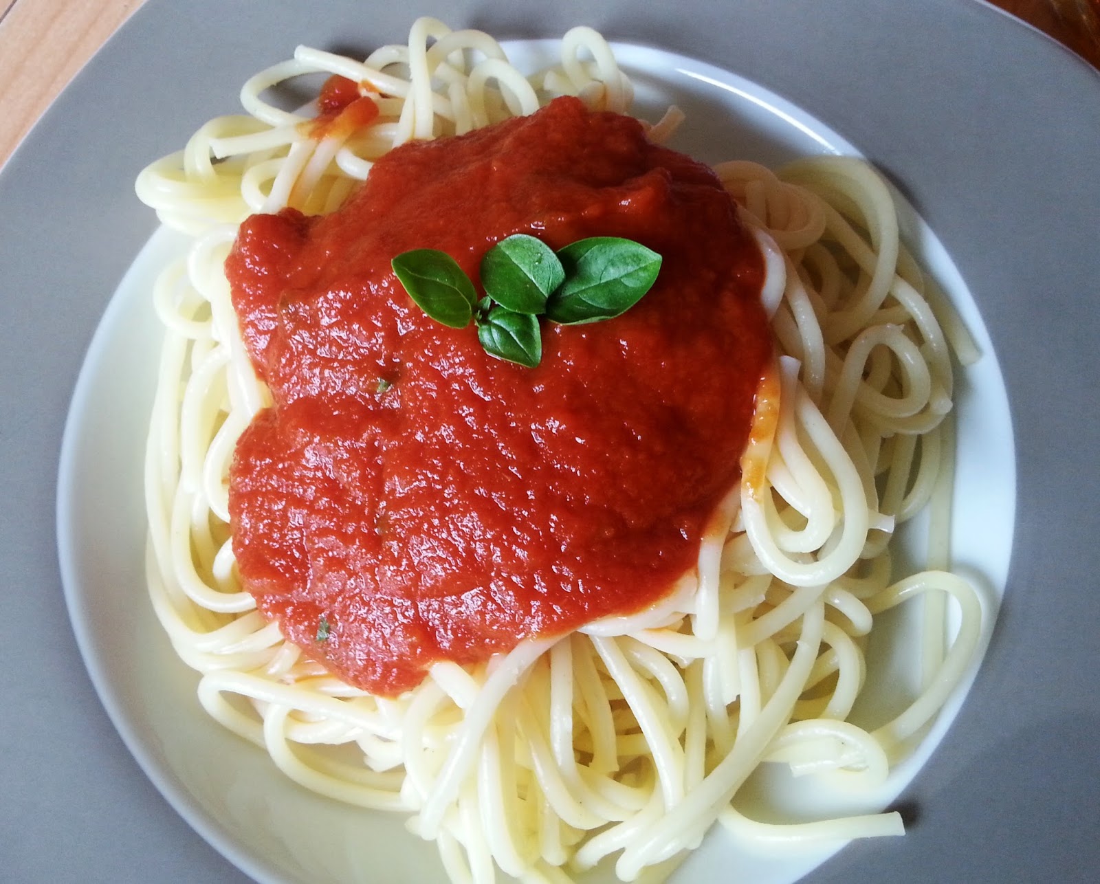 Zutaten:1 kleine Zwiebel1 kleine Möhre2 Stangen Staudensellerie1 Knoblauchzehe1 EL Olivenöl1 EL Zucker3 Dosen Tomatenstücke a 425 g (oder 2 Pakete passierte Tomaten a 500 ml)1 EL Tomatenmark2 Stängel frische Oregano (alternativ 1-2 EL getrockneter nach Geschmack)eine Handvoll Basilikum frisch, in Streifen geschnittenSalz, weißer PfefferZubereitung:Zwiebel und Möhre schälen, in kleine Würfelchen schneiden. Staudensellerie in feine Scheibchen schneiden.Knoblauch schälen und ebenfalls ganz fein würfeln.Öl in einem hohen Topf erhitzen, Gemüse darin andünsten.**