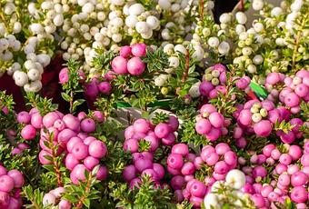 Die Torfmyrte (Pernettya mucronata) gehört zu den Heidekrautgewächsen und stammt ursprünglich aus dem südlichen Teil Südamerikas. Der immergrüne Strauch erreicht eine Höhe von einem halben Meter und besitzt dunkelgrüne, lederartigen Blätter, die in einer dornigen Spitze enden. Er bildet lange, flache Wurzeln und ist in Heidegärten oft als Bodendecker anzutreffen. Im Frühjahr erzeugen die weiblichen Pflanzen weiß-rosa Blüten, die von der Form her an kleine Glöckchen erinnern und in Trauben angeordnet sind.