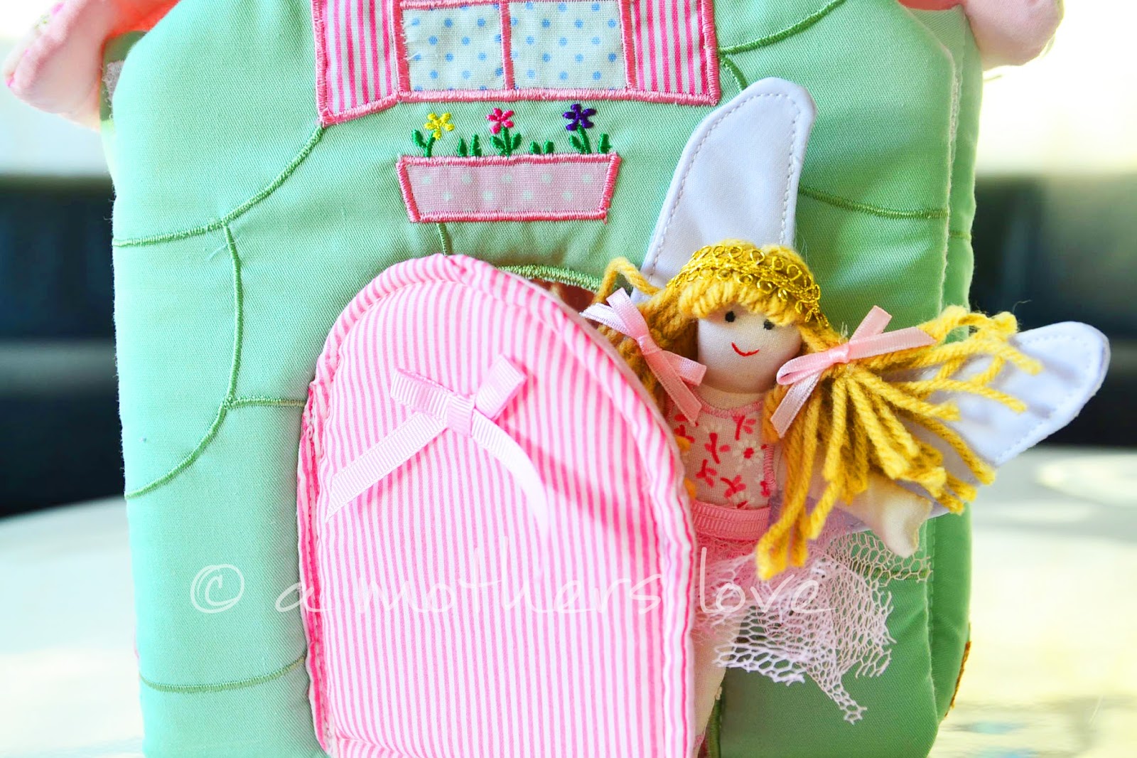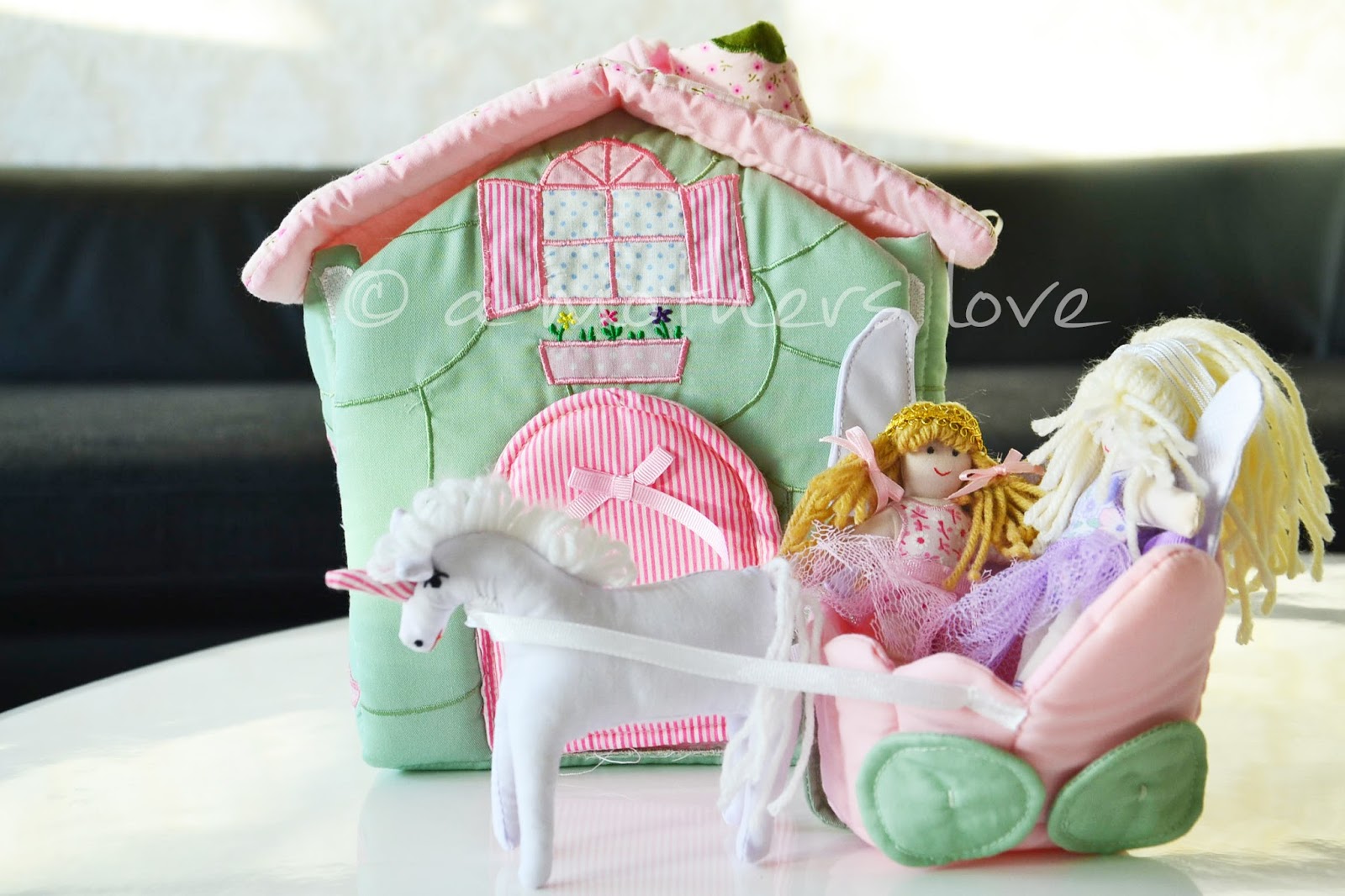 Am Haus kann man die Tür öffnen oder die ganze Vorderseite. Mit einem kleinen Tragegriff lässt sich das Täschchen überall hin mit nehmen =) Das Häuschen lässt sich prima mitnehmen und auch der gesamte Inhalt kann zum Beispiel für ein Puppenhaus verwendet werden =)