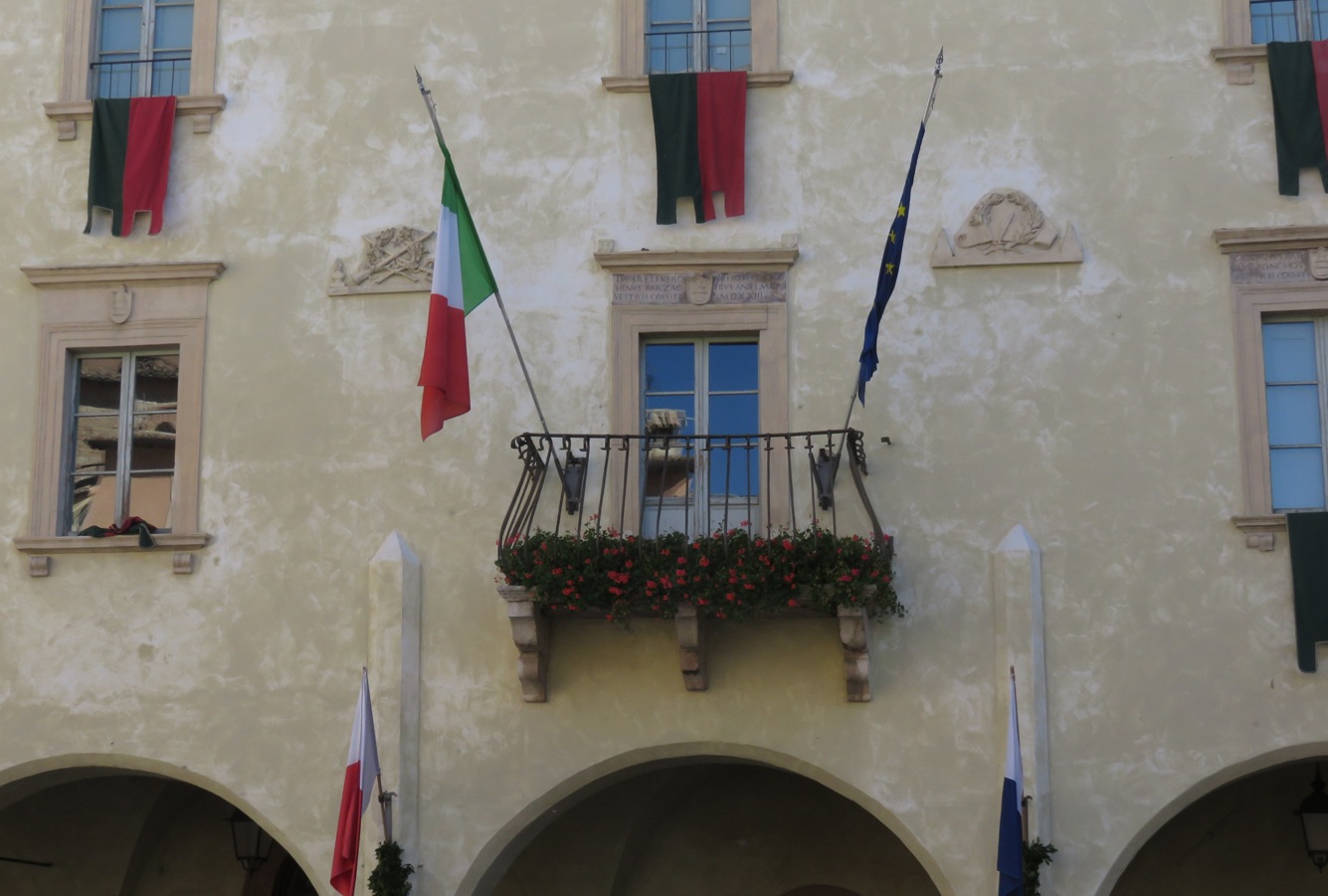 Das Rathaus, ein repräsentatives Gebäude an der Piazza Mazzini, war - wohl anlässlich des Marktfestes - beflaggt: