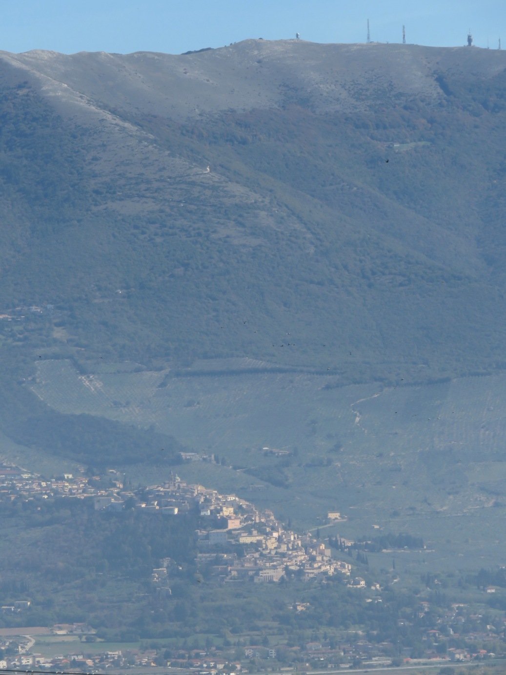 Aber dieser hier, an der Casa Petrucci, datiert ja auch schon von 1512: Dafür ist der Fassadenschmuck doch erstaunlich gut erhalten?Unser nächstes Ziel war Montefalco; auf dem folgenden Foto von Trevi aus herangezoomt (genauer: vom "Largo Don Bosco" beim Museumszentrum im ehemaligen Franziskanerkloster). Ein leichter Nebelschleier lag noch immer über der Ebene, doch sah das Kameraobjektiv Montefalco klarer als mein Auge: