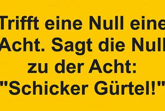 Auf Facebook teilen Vorige Folgende Trifft eine Null eine Acht. Sagt die Null zu... Autor des Artikels : istdaslustig Zum Original-Artikel Trifft eine Null eine Acht. Sagt die Null zu der Acht: "Schicker Gürtel!" Hier geht es zum Artikel Mehr Lustiges auf www.istdaslustig.de Auf Facebook teilen Vorige Folgende Das könnte Ihnen gefallen Mehr