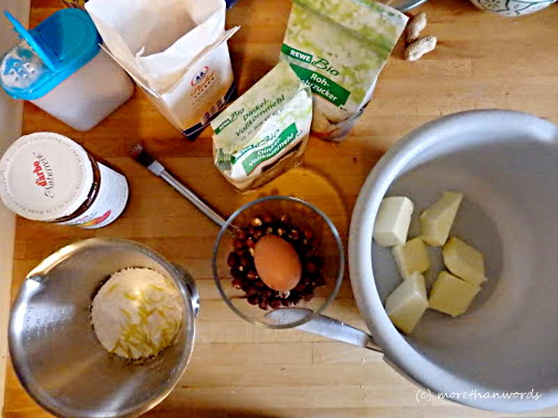 Zutaten:150g weiche Butter100g Puderzuckerabgeriebene Schale von 1 Zitrone1 Prise Salz1 Ei200g Dinkelvollkornmehl100g Haselnüsse (am besten frisch gemahlen)MarillenmarmeladeDie Zutaten nacheinander verrühren, so dass ein glatter Teig entsteht. Dann 1 - 2 Stunden kalt stellen.